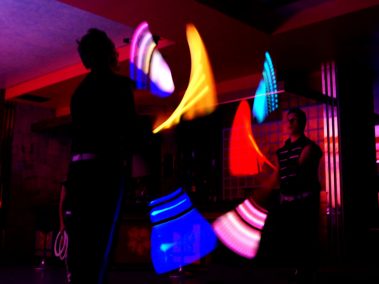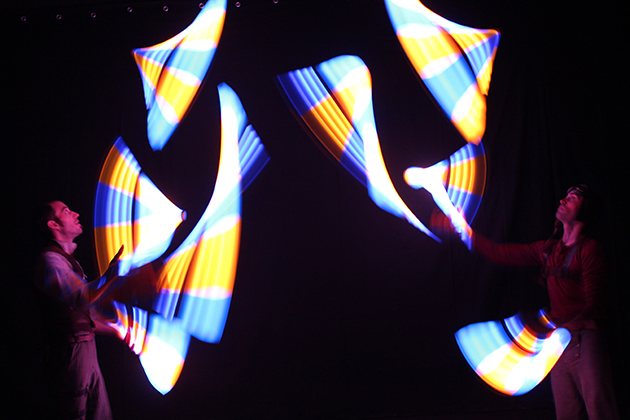 Les objets lumineux de jonglerie utilisés sont les anneaux, balles et massues lumineuses à changement de couleurs programmés ainsi que des étonnants bolas lumineux.
